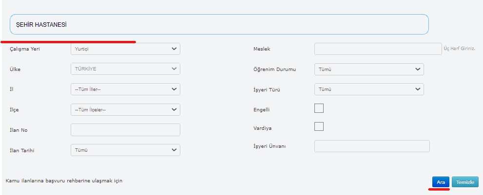Aradığınız pozisyon yazan kısma "ŞEHİR HASTANESİ" yazın ve ardından ara yazan kısma basın ilanlar aşağıda sıralanacaktır.
