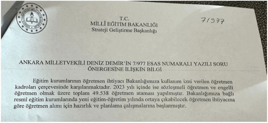 ANKARA MİLLETVEKİLİ DENİZ DEMİR'İN 7/977 ESAS NUMARALI YAZILI SORU ÖNERGESİNE İLİŞKİN BİLGİ
