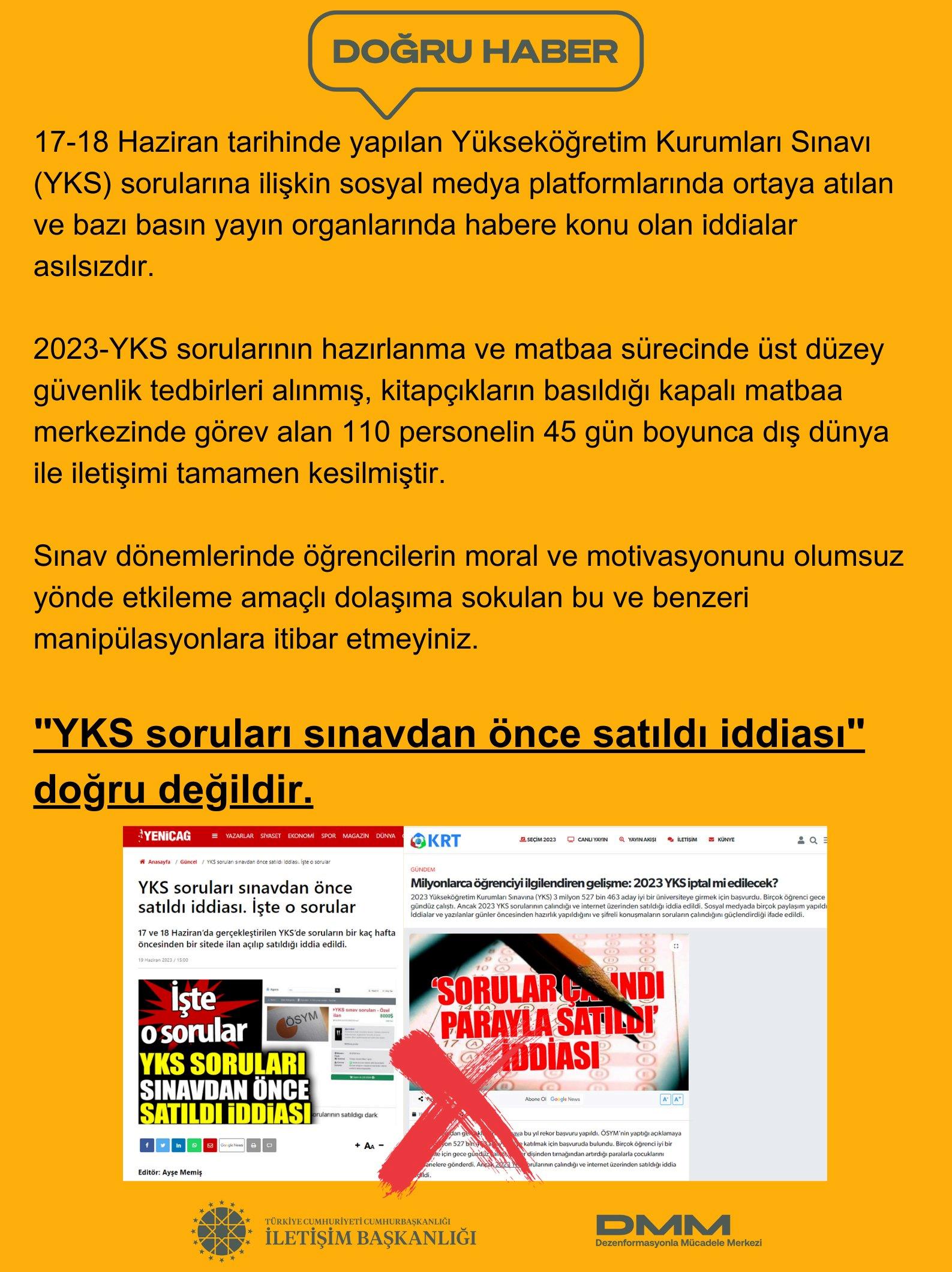 Cumhurbaşkanlığı Dezenformasyonla Mücadele Merkezi tarafından konu ile ilgili yapılan son dakika açıklamasında YKS sorularının sınavdan önce internet üzerinde bir site üzerinde 3-4 bin dolar paraya satıldığı iddialarına cevap verildi. Yapılan son dakika açıklamasında, "YKS soruları sınavdan önce satıldı iddiası" doğru değildir" denildi ve şu ifadelere yer verildi: "Sınav dönemlerinde öğrencilerin moral ve motivasyonunu olumsuz yönde etkileme amaçlı dolaşıma sokulan bu ve benzeri manipülasyonlara itibar etmeyiniz"