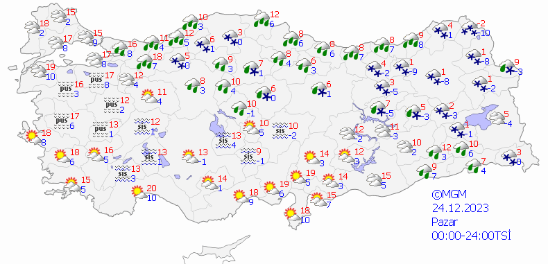 24 Aralık tarihli hava durumuna baktığımızda Doğu Anadolu'da ve Karadeniz'in iç kesimlerinde kar yağışlarının etkili olacağı bildirildi.