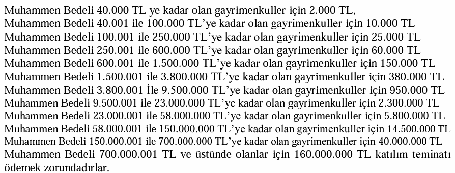 Arsaların muhammen bedelleri üzerinden teminat ödemesi yapılacak. Bankaya yatırılacak teminat ödemesi, muhammen bedellere göre şu şekilde olacak: