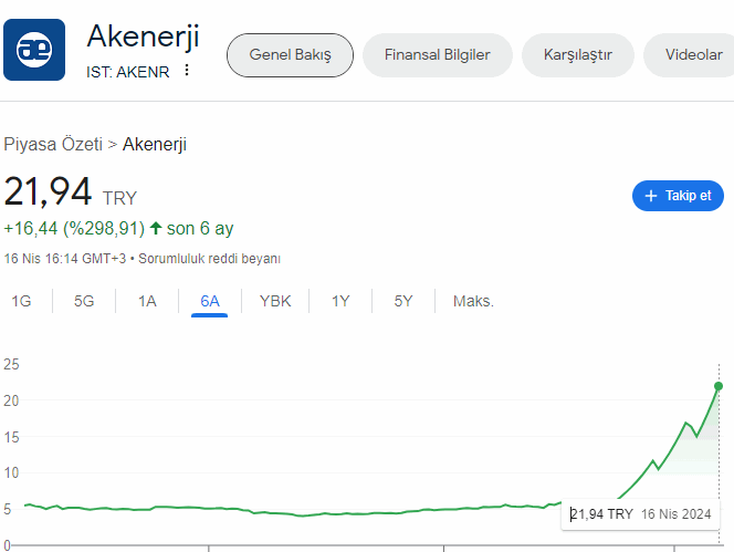 16 Ekim 2023 tarihinde 5.50 TL olan hisse, 13 Mart 2024 tarihinde, yani 5 ay sonra 5.34 TL seviyesindeydi. 5 ay boyunca bu aralıkta seyreden Akenerji hissesi, son 1 ay içinde 5.34 TL seviyesinden 21.94 TL seviyesine kadar çıkarak rekor yükseliş kaydetti.