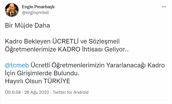 Gazeteci Engin Pınarbaşlı sosyal medya hesabı üzerinden konu ile ilgili yaptığı açıklamada şu ifadeleri kullandı: "Bir Müjde Daha Kadro Bekleyen ÜCRETLİ ve Sözleşmeli Öğretmenlerimize KADRO İhtisası Geliyor. @tcmeb Ücretli Öğretmenlerimizin Yararlanacağı Kadro İçin Girişimlerde Bulundu. Hayırlı Olsun TÜRKİYE"
