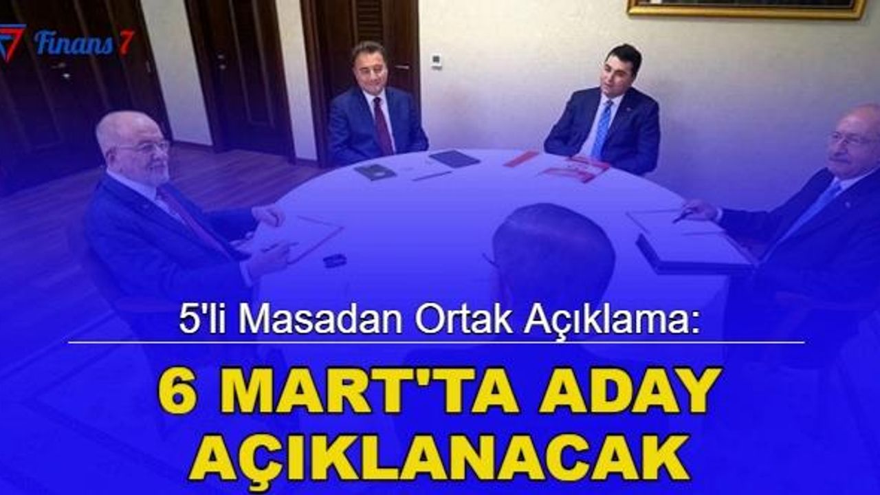Saadet Partisi Genel Merkezi'nde Parti Genel Başkanı Temel Karamollaoğlu ev sahipliğinde gerçekleştirilen Beşli Masa toplantısı sona erdi. 4 buçuk saat süren toplantıya ilişkin bir son dakika açıklaması yapıldı. Yapılan açıklamada, "6 Mart'ta ortak aday açıklanacak" denildi.