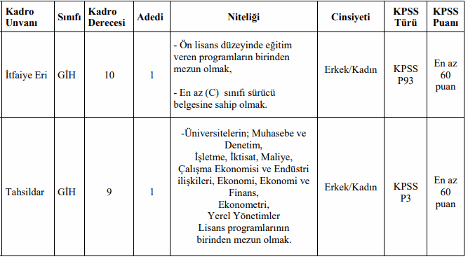 Tahsildar kadrosu için evraklar şahsen , posta yolu ile ya da [email protected] adresine mail ile yapılabilir. İtfaiye kadro için başvurular şahsen yapılacak.