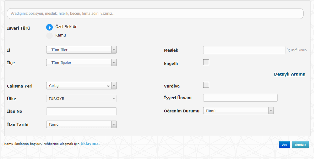 Bu ekranda gösterdiğimiz gibi MESLEK kısmında , başvuru yapmak istediğiniz kadronun adını yazın ve il seçimi yaparak ARA butonuna tıklayın. Ara butonuna tıkladığınızda aşağıda ilanlar sıralanacaktır. İlanlara tıklayarak başvurunuzu internet üzerinden yapabilirsiniz.