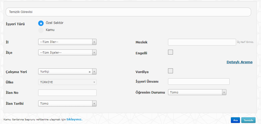 İŞKUR üzerinden yayınlanan personel alımlarına baktığımızda temizlik görevlisi kadrosuna 6 bin 12, hastane temizlik görevlisi kadrosuna 56 temizlik işçisi kadrosuna 655 olmak üzere toplamda 6 bin 723 temizlik görevlisi alımı yapıldığı görülüyor. İşte İŞKUR sayfasındaki ilanların ekran görüntüsü: