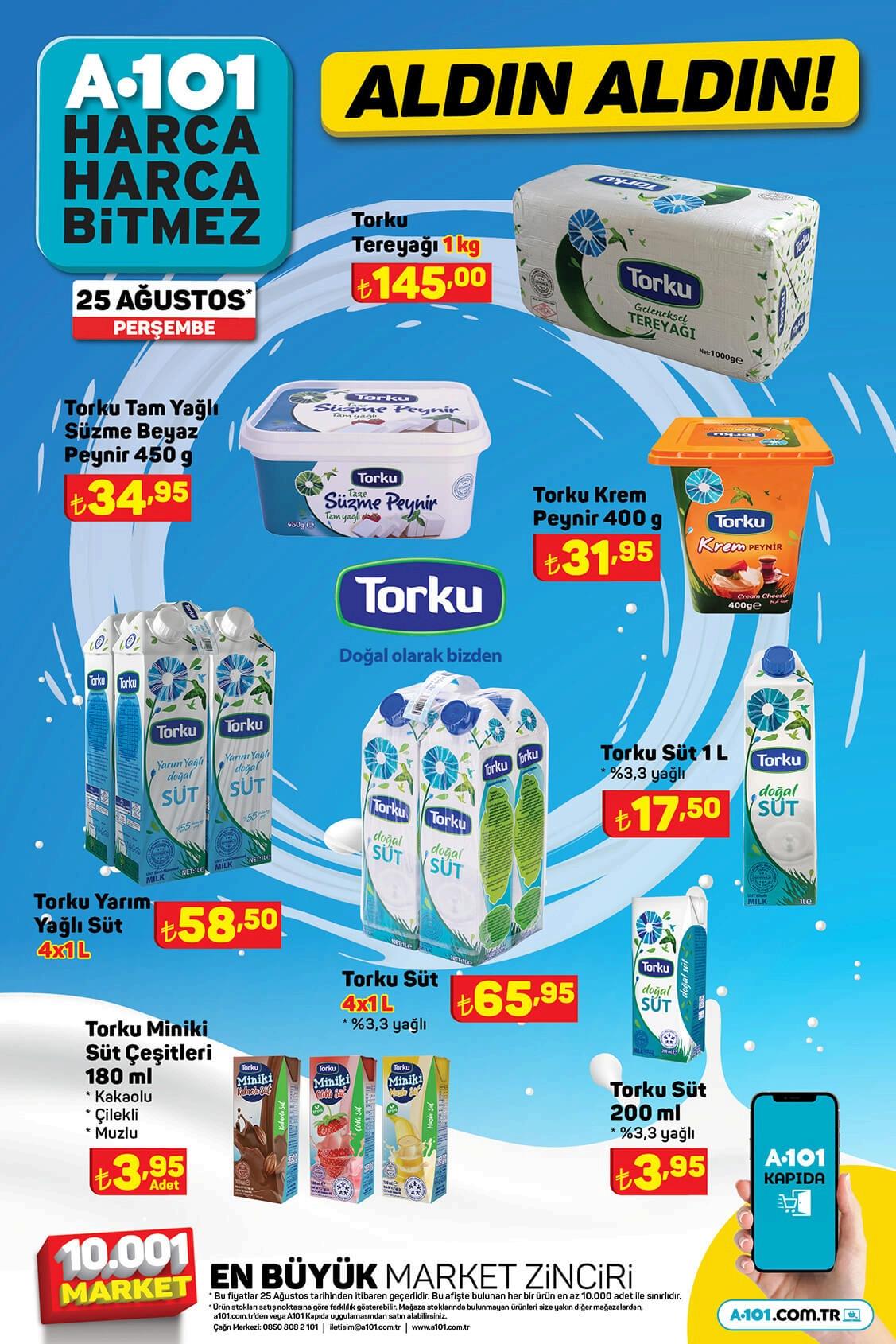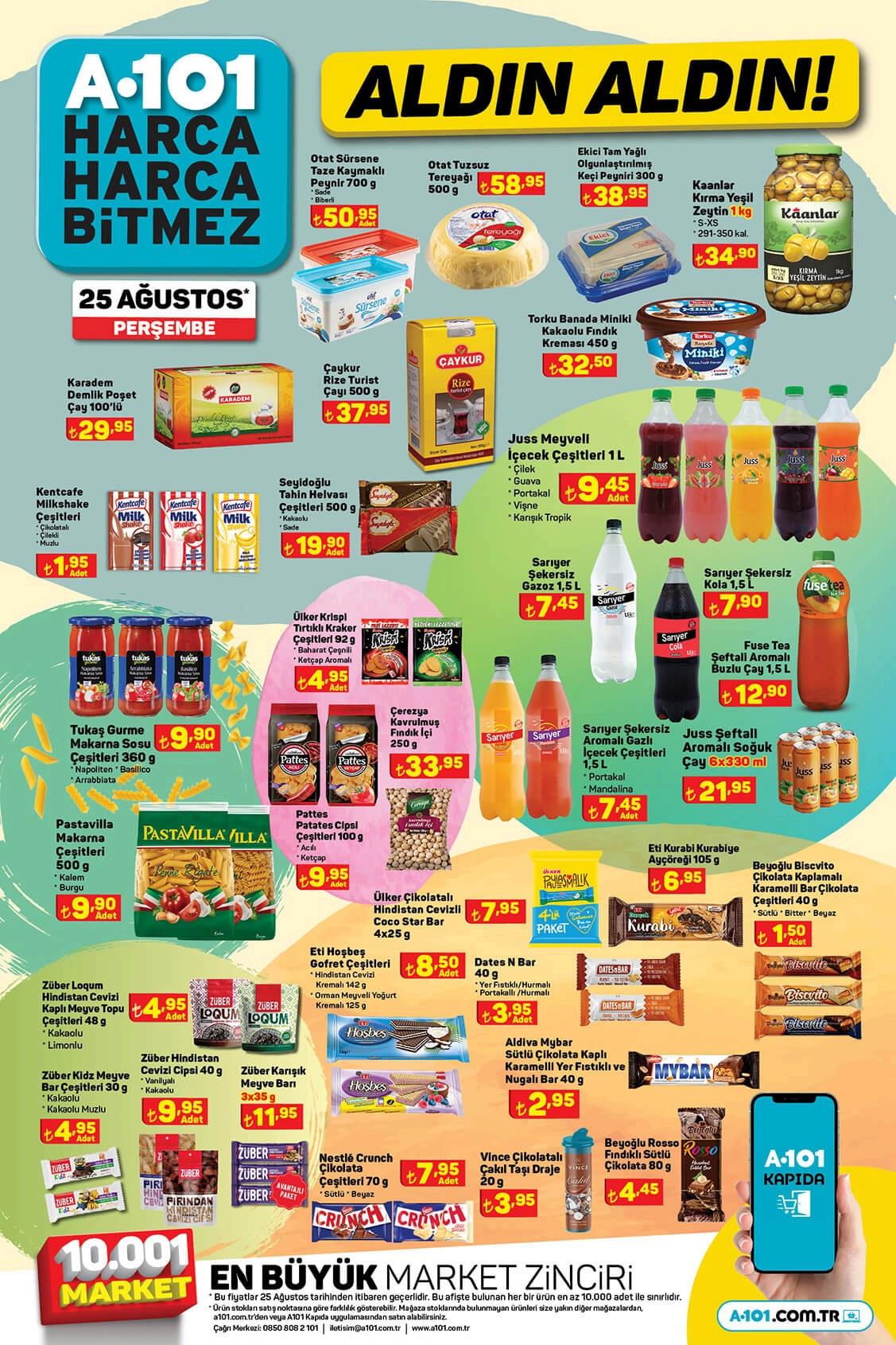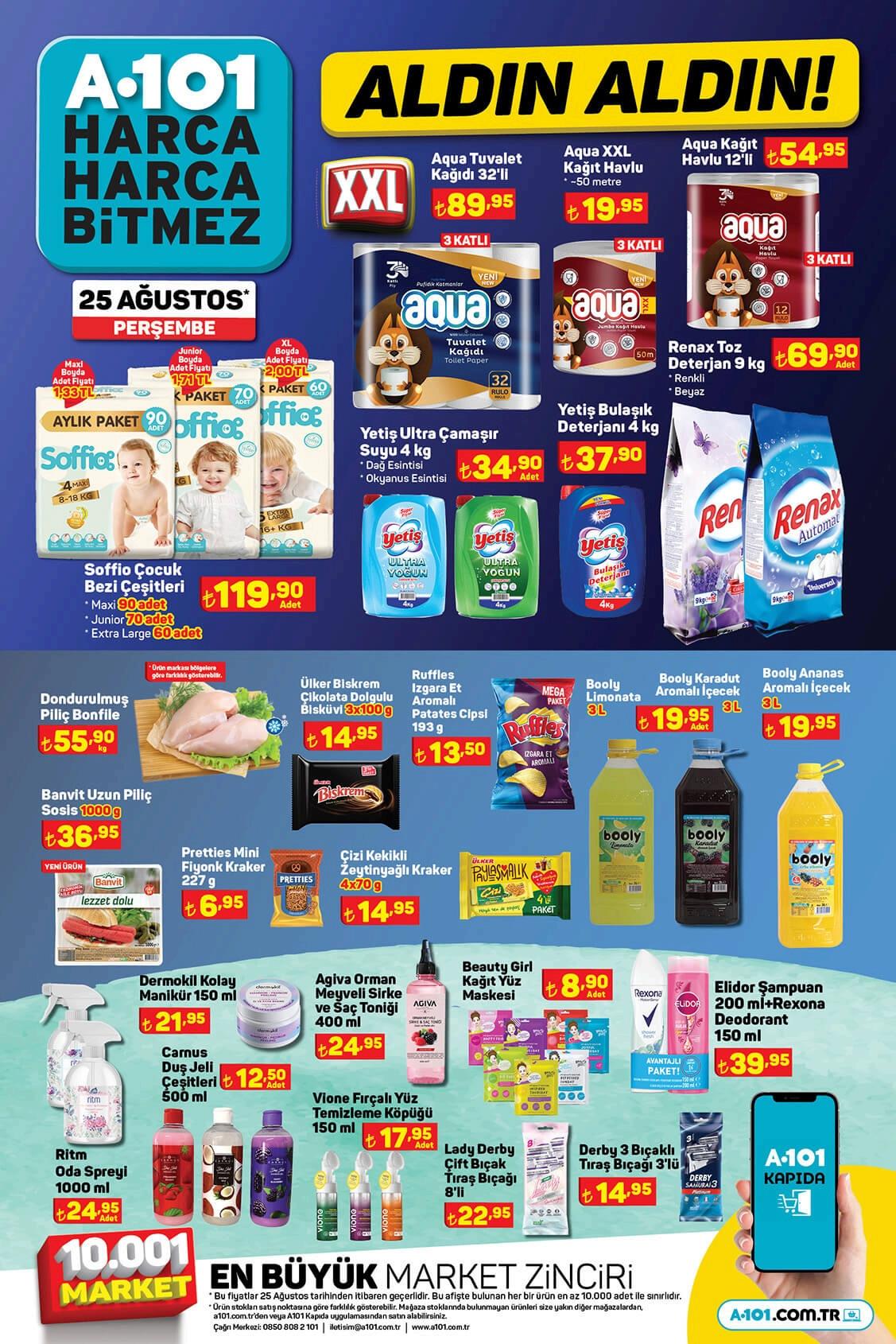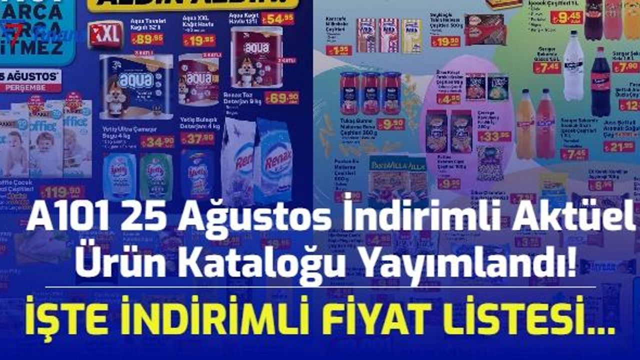 A101 marketlerde 25 Ağustos Perşembe gününden itibaren geçerli Aldın Aldın kampanya ürünlerinde fiyat listesi şöyle: