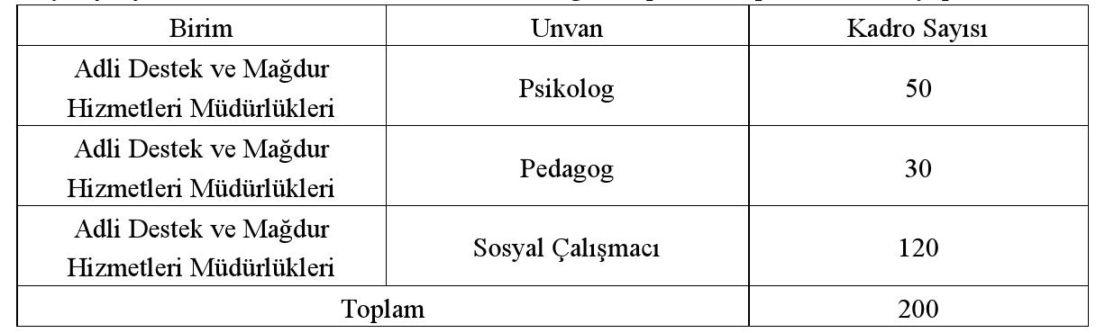 Adalet Bakanlığı Memur Sınav, Atama ve Nakil Yönetmeliği hükümleri doğrultusunda, Adli Destek ve Mağdur Hizmetleri Müdürlüklerinde çalıştırılmak üzere psikolog, pedagog ve sosyal çalışmacı kadrolarına sözlü sınav sonucuna göre toplam 200 personel alımı yapılacaktır.