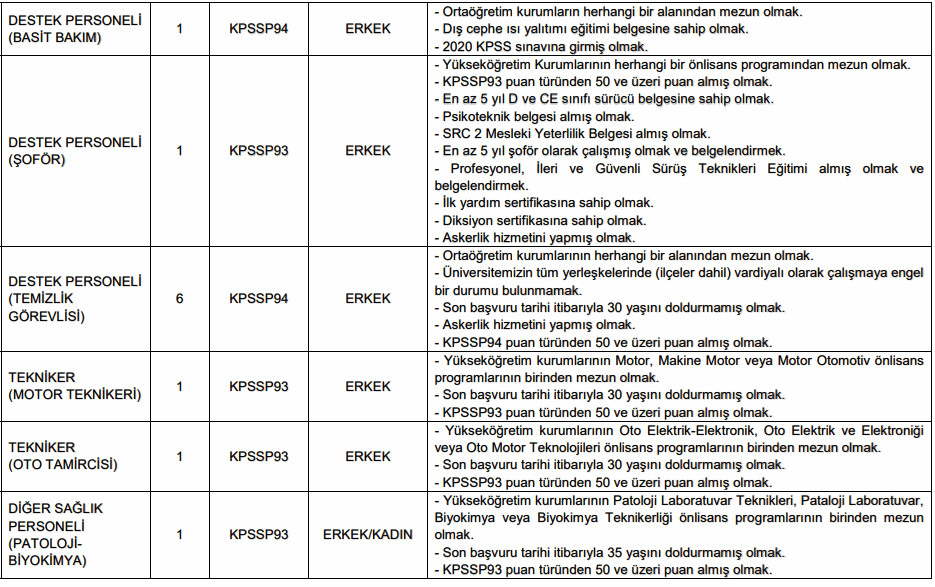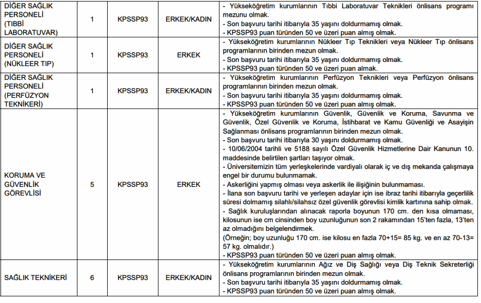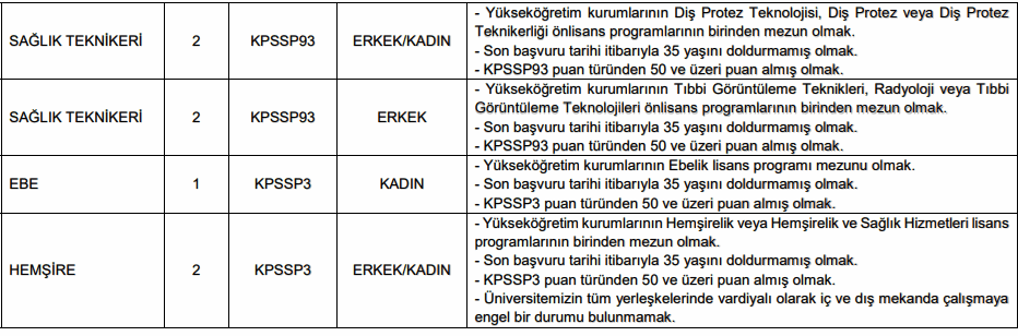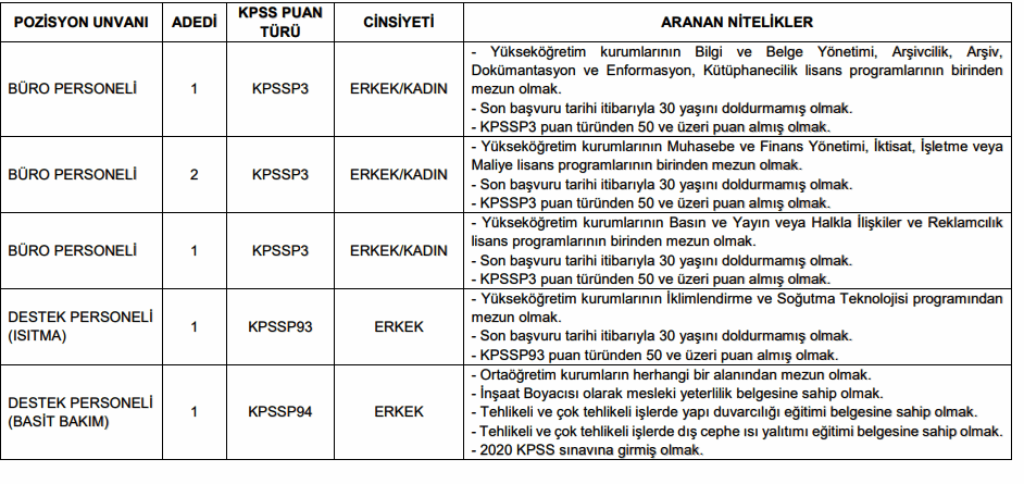 KPSS 50 puan şartı ile yapılacak en az lise mezunu personel alımında adaylar, sağlık personeli, büro memuru, teknik personel, şoför ve güvenlik görevlisi gibi kadrolarda istihdam edilecek. İlanın başvuru şartları şu şekilde: