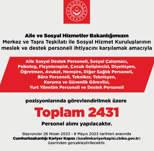 Aile ve Sosyal Hizmetler Bakanlığı, 2 bin 431 personel alımı için başvurular 28 Nisan 2023 - 8 Mayıs 2023 tarihleri arasında Cumhurbaşkanlığı Kariyer Kapısı (isealimkariyerkapisi.cbiko.gov.tr) üzerinden gerçekleştirilecek.