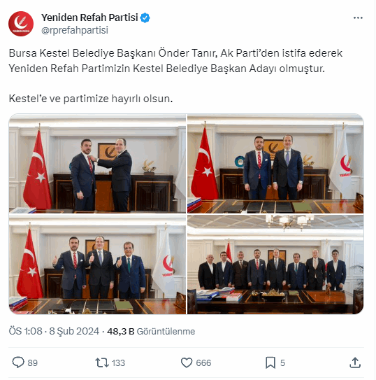 "Bursa Kestel Belediye Başkanı Önder Tanır, AK Parti'den istifa ederek Yeniden Refah Partimizin Kestel Belediye Başkan Adayı olmuştur. Kestel'e ve partimize hayırlı olsun."