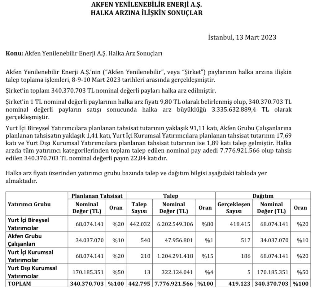 Akfen Yenilenebilir Enerji AŞ'nin paylarının halka arzına ilişkin talep toplama işlemleri, 8-9-10 Mart 2023 tarihleri arasında gerçekleşmiştir.