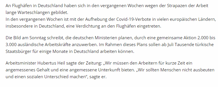 Bild am Sonntag adlı gazeteye açıklamada bulunan Çalışma Bakanı Hubertus Heil, iyi bir maaş ve kalacak yer sözü vererek, 'Çalışanlara iyi bir maaş ve kısa bir için düzgün bir kalacak yer sağlamalıyız. İnsanları sömürmemeli ve sosyal bir fark yaratmamalıyız' ifadelerini kullandı.