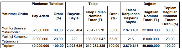 Yurt İçi Bireysel Yatırımcılar tahsisat tutarının yaklaşık 2,2 katı, Yurt İçi Kurumsal Yatırımcılar tahsisat tutarının yaklaşık 17,5 katı olmak üzere toplamda 5,3 kat filtrelenmemiş talep gelmiştir.