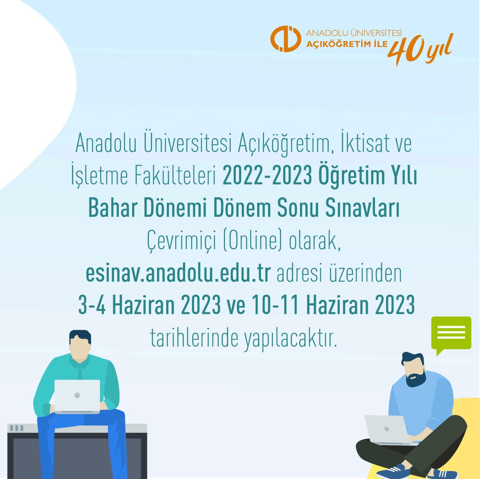Açıklamada, "Anadolu Üniversitesi Açıköğretim, İktisat ve İşletme Fakülteleri 2022-2023 Öğretim Yılı Bahar Dönemi Dönem Sonu Sınavları Çevrimiçi (Online) olaral, esinav.anadolu.edu.tr adresi üzerinden 3-4 Haziran 2023 ve 10-11 Haziran 2023 tarihlerinde yapılacaktır" ifadelerine yer verildi ve sınavların internet üzerinden, online olarak yapılacağına yer verildi.
