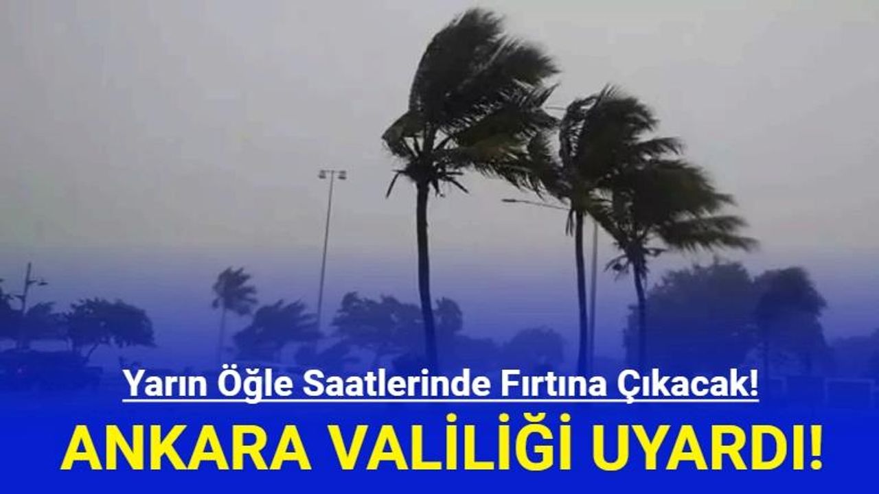 Ankara Valiliği, yarın öğlen saatlerinde kent genelinde kuvvetli rüzgar ve kısa süreli fırtına (40-60 km/saat, kısa süreli 70-80 km/saat) beklendiğini duyurdu ve vatandaşları tedbirli olmaya çağırdı.