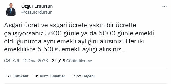 Bir diğer değerlendirmede ise şu ifadelere yer verildi: "Asgari ücret ve asgari ücrete yakın bir ücretle çalışıyorsanız 3600 günle ya da 5000 günle emekli olduğunuzda aynı emekli aylığını alırsınız! Her iki emeklilikte 5.500₺ emekli aylığı alırsıniz"