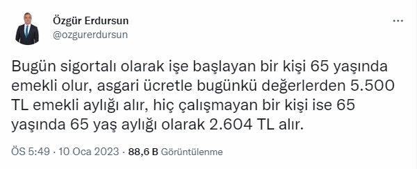 Tüm bunların yanı sıra emekli olmayı hayal eden vatandaşlar, emekli olduklarında ne kadar maaş alacaklarını araştırmaya başladı. Bir işyerinde çalışan vatandaşlar, emekli olduklarında aldıkları maaşa göre ne kadar emekli maaşı alacaklarını soruyor. Bu konuda cevap Sosyal Güvenlik Uzmanı Özgür Erdursun'dan geldi. Erdursun yaptığı son dkaika açıklamasında, "Bugün sigortalı olarak işe başlayan bir kişi 65 yaşında emekli olur, asgari ücretle bugünkü değerlerden 5.500 TL emekli aylığı alır, hiç çalışmayan bir kişi ise 65 yaşında 65 yaş aylığı olarak 2.604 TL alır" ifadelerini kullandı.