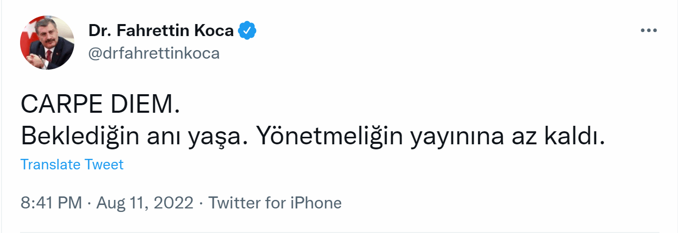 Bakan Koca, akşam saatlerinde sosyal medyadan dikkat çeken bir paylaşım yaptı. Paylaşımında, "Carpe Diem. Beklediğin anı yaşa. Yönetmeliğin yayınına az kaldı" notunu düştü.
