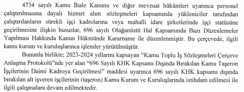 Bununla birlikte 2023-2024 yıllarını kapsayan "Kamu Toplu İş Sözleşmeleri Çerçeve Anlaşma Protokolü"nde yer alan "696 Sayılı KHK Kapsamı Dışında Bırakılan Kamu Taşeron İşçilerinin Daimi Kadroya Geçirilmesi" maddesi uyarınca 696 sayılı KHK kapsamı dışında bırakılan alt işveren işçilerinin (taşeron) Kamu Kurum ve Kuruluşlarında istihdam edilmesi ile ilgili çalışmalara devam edilmektedir"