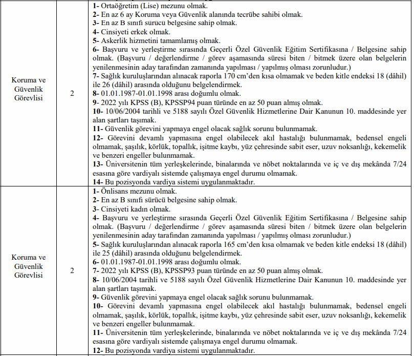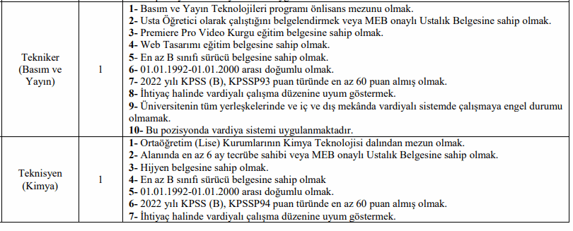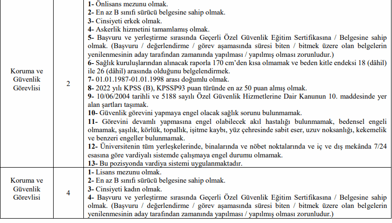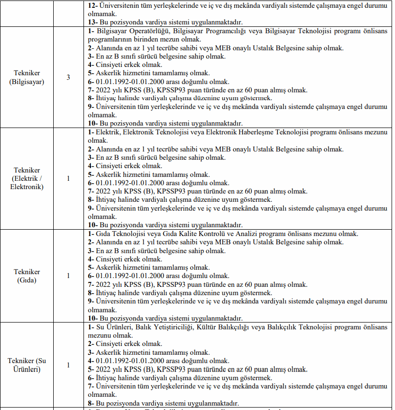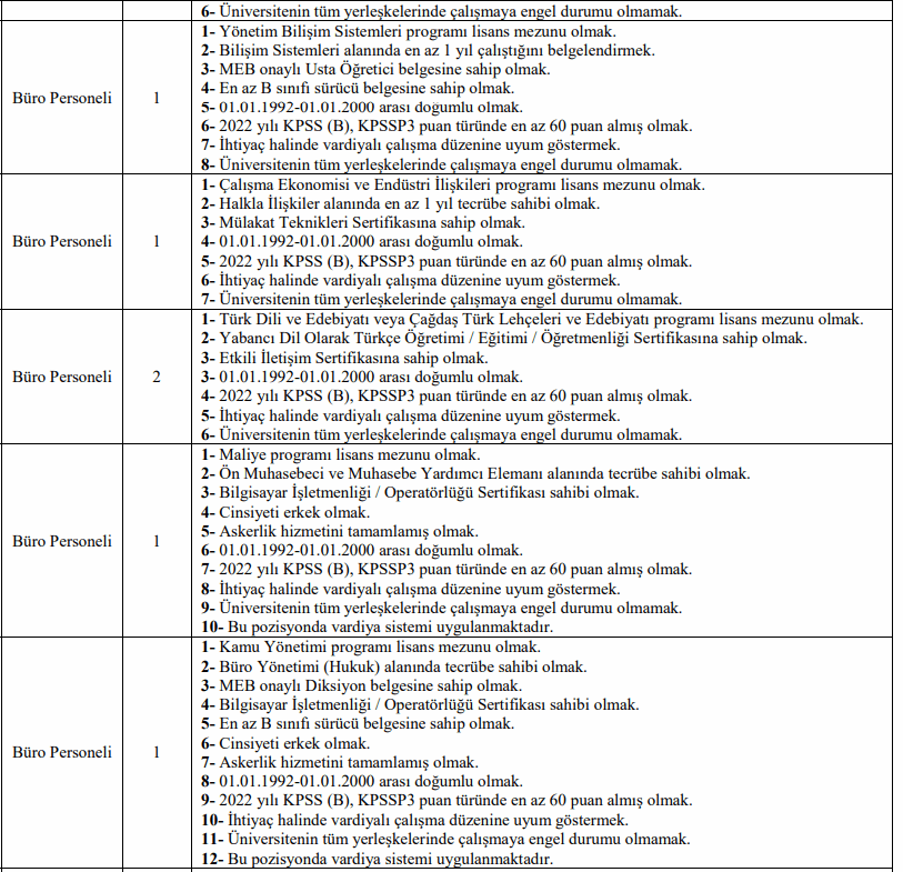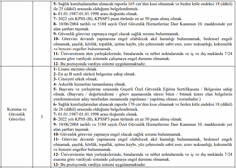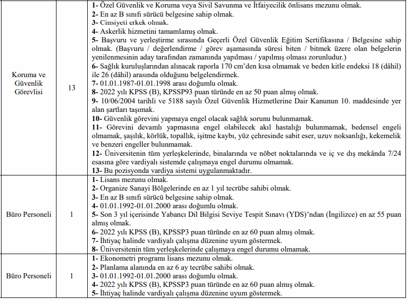 Üniversitenin personel alımına başvuru yapacak adaylarda aranan şartlar şu şekilde: