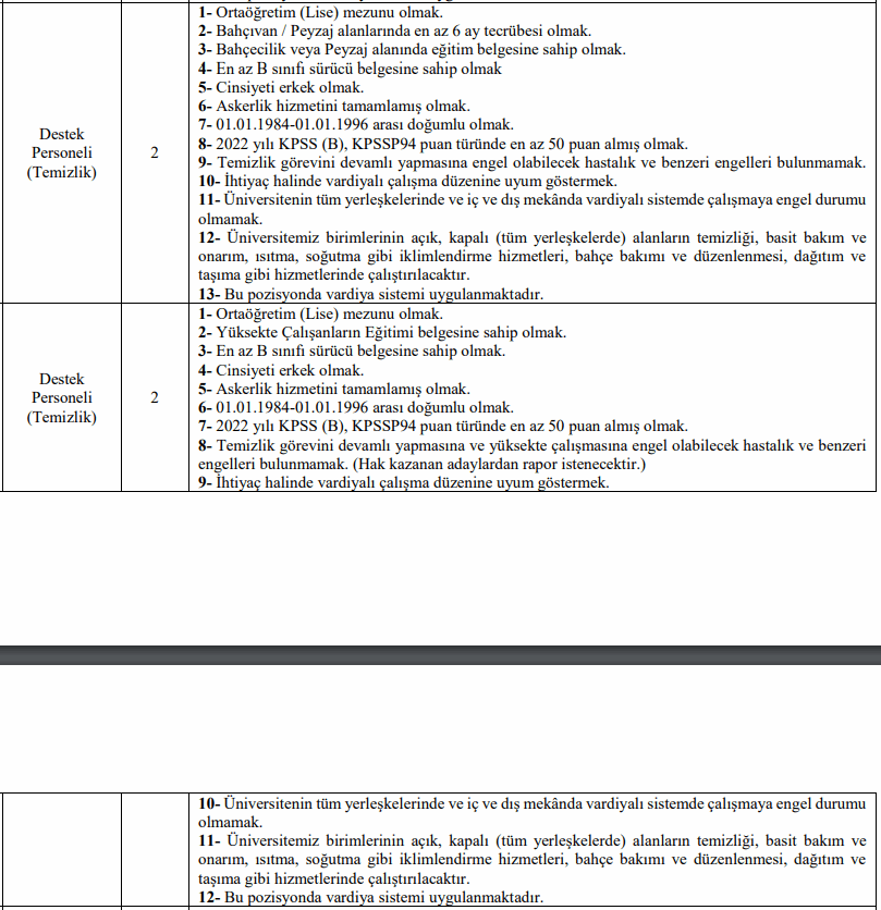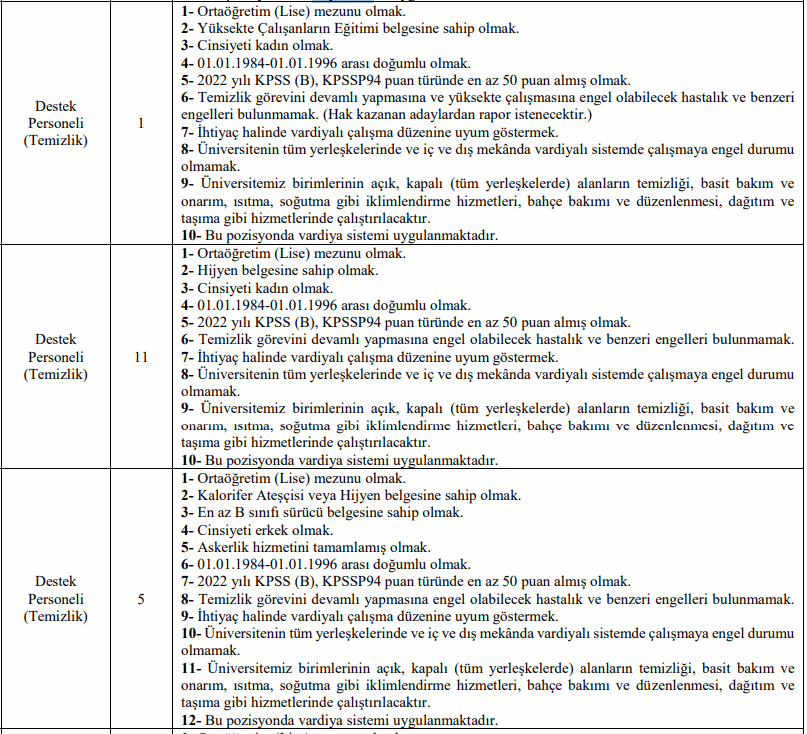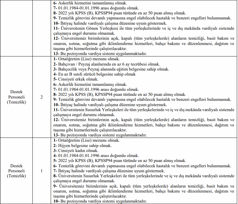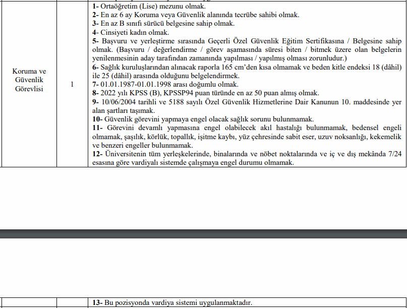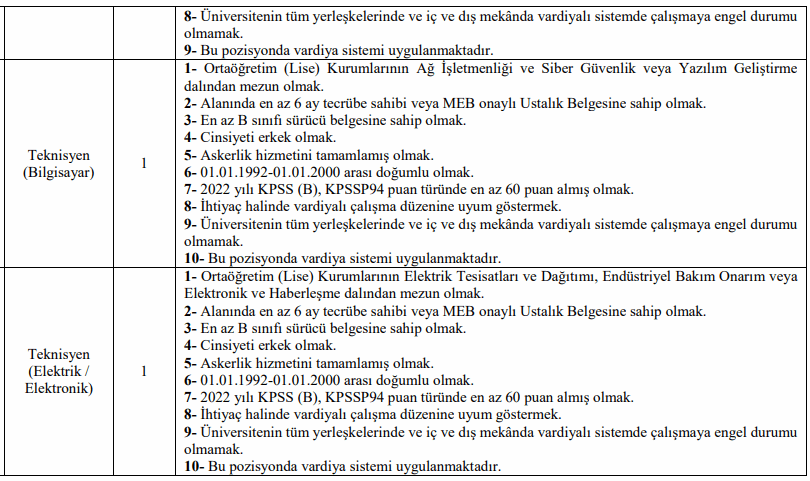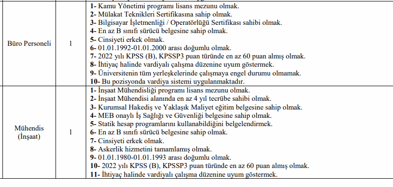 Üniversitenin personel alımına başvuru yapacak adaylarda aranan şartlar şu şekilde: