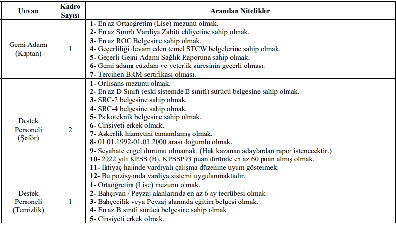Bandırma Onyedi Eylül Üniversitesince yayınlanan duyuruda alınacak adayların gemi kaptanı, şoför, temizlik personeli, güvenlik görevlisi, büro personeli, inşaat mühendisi, bilgisayar teknikeri, elektrik elektronik teknikeri, gıda teknikeri, su ürünleri teknikeri, basım yayın tekikeri, bilgisayar teknisyeni ve elektrik elektronik teknisyeni kadrolarında istihdam edileceğine yer verildi.