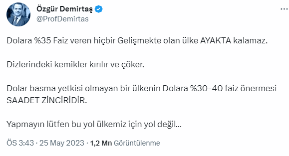 Ünlü Ekonomist Özgür Demirtaş bir son dakika açıklamasında bulundu. Demirtaş, dolar mevduat hesaplarındaki faiz oranlarına tepki gösterdi ve dolar kuruna yüzde 35 faiz veren hiçbir ülkenin ayakta kalamayacağını söyledi.