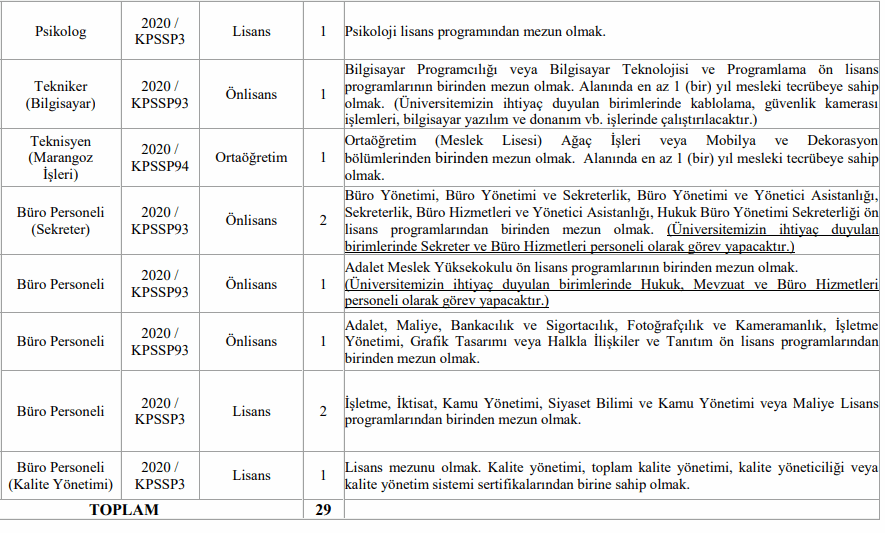 2) 2020 yılı Kamu Personeli Seçme Sınavı KPSS (B) Grubundan Lisans mezunları için P3 puan türünden, Önlisans mezunları için P93 ve Ortaöğretim mezunları için P94 puan türünden en az 50 puan almış olmak.