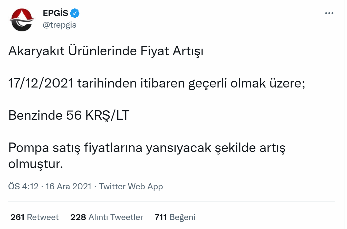 "Akaryakıt Ürünlerinde Fiyat Artışı 17/12/2021 tarihinden itibaren geçerli olmak üzere; benzinde 56 KRŞ/LT Pompa satış fiyatlarına yansıyacak şekilde artış olmuştur."