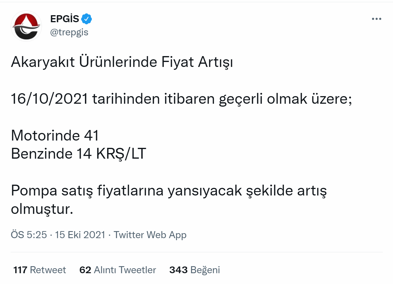 Motorin ve benzine yapılan zamlar EPGİS'in sosyal medya hesabından duyuruldu. EPGİS, benzine 37 kuruş zam yapıldığını, ancak bunun 23 kuruşluk kısmının eşel mobil sistemi uyarınca ÖTV’den karşılandığını, ancak 14 kuruşluk zammın pompaya yansıyacağını bildirdi. Açıklama şu şekilde;