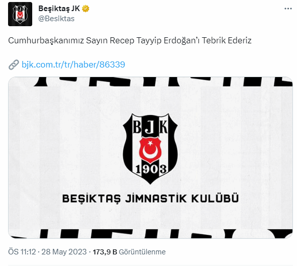 Kulüpten yapılan açıklamada, "Bugün gerçekleştirilen Cumhurbaşkanlığı seçiminde aziz milletimizin teveccühleriyle yeniden Cumhurbaşkanımız seçilen Sayın Recep Tayyip Erdoğan'ı Beşiktaş Camiası olarak tebrik eder, yeni dönemin ülkemiz ve milletimiz için hayırlı olmasını temenni ederiz" denildi.