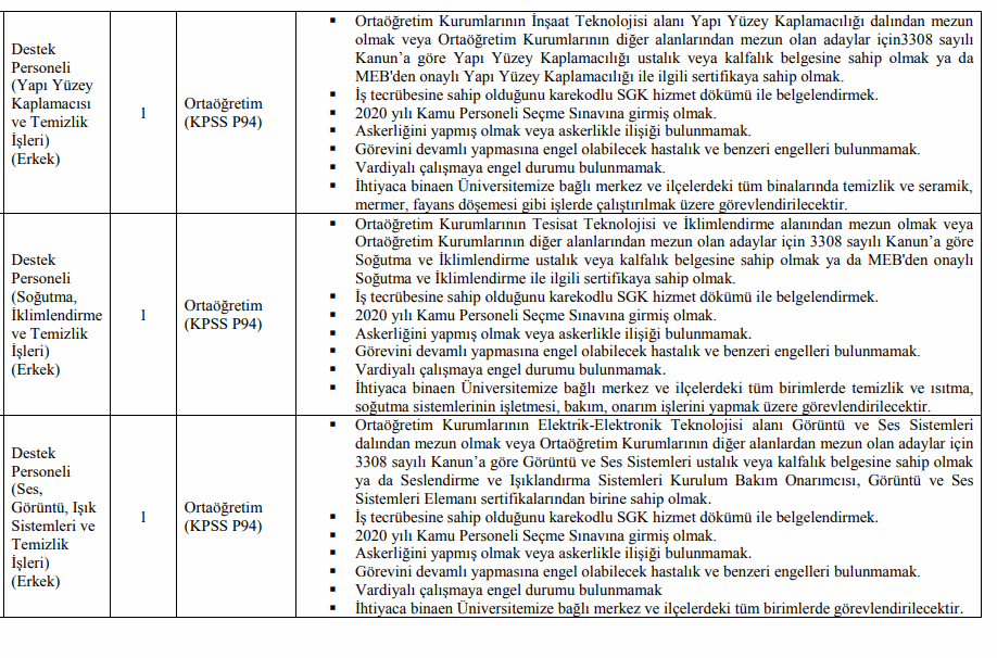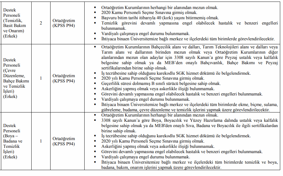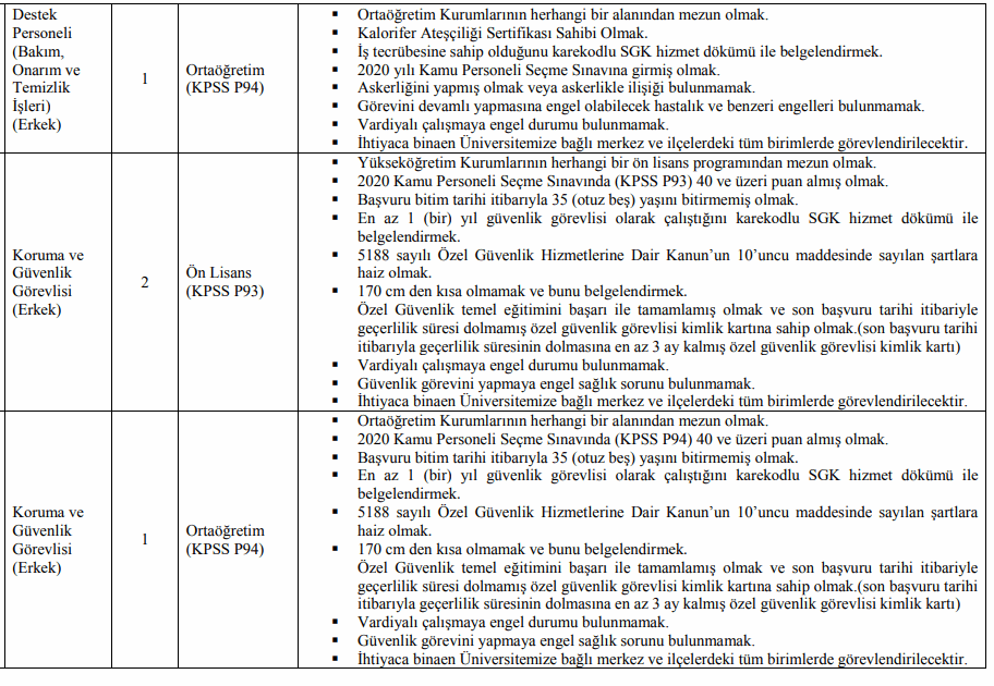 "Üniversitemiz birimlerinde 657 sayılı Devlet Memurları Kanunu'nun 4'üncü maddesinin (B) fıkrası uyarınca istihdam edilmek üzere, 06.06.1978 tarihli ve 7/15754 sayılı Bakanlar Kurulu Kararı ile yürürlüğe konulan 'Sözleşmeli Personel Çalıştırılmasına İlişkin Esaslar'da yer alan Ek 2 nci maddenin (b) fıkrası gereğince 'Yazılı ve/veya sözlü sınav yapılmaksızın, KPSS (B) grubu puan sıralaması esas alınmak suretiyle' aşağıda belirtilen pozisyonlara sözleşmeli personel alınacaktır." ifadeleri ile yayımlanan duyuruda başvuru bilgileri şu şekilde verildi: