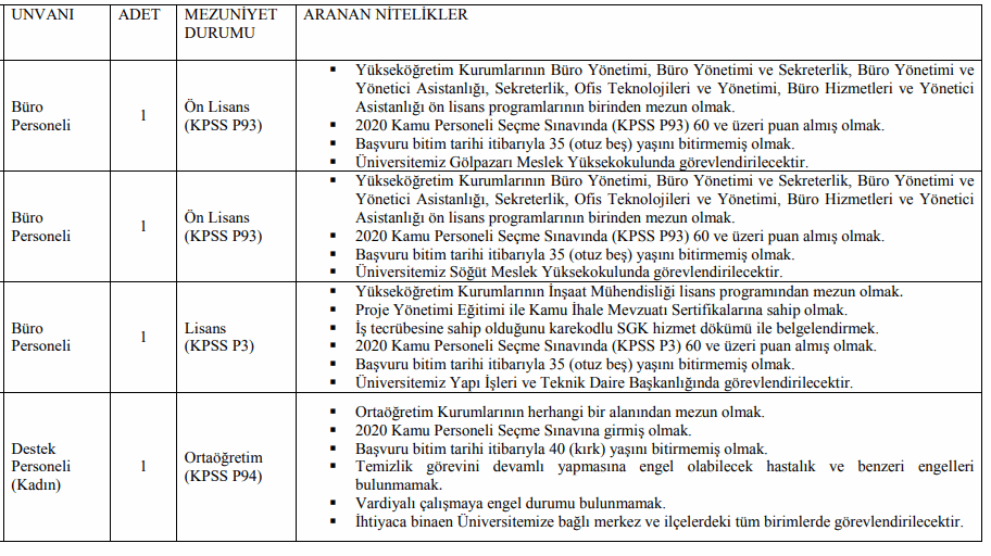 Bilecik Şeyh Edebali Üniversitesi tarafından bir açıklama yapıldı. Yapılan açıklamada en az lise mezunu adaylar arasından personel alımı yapılacağına yer verildi.