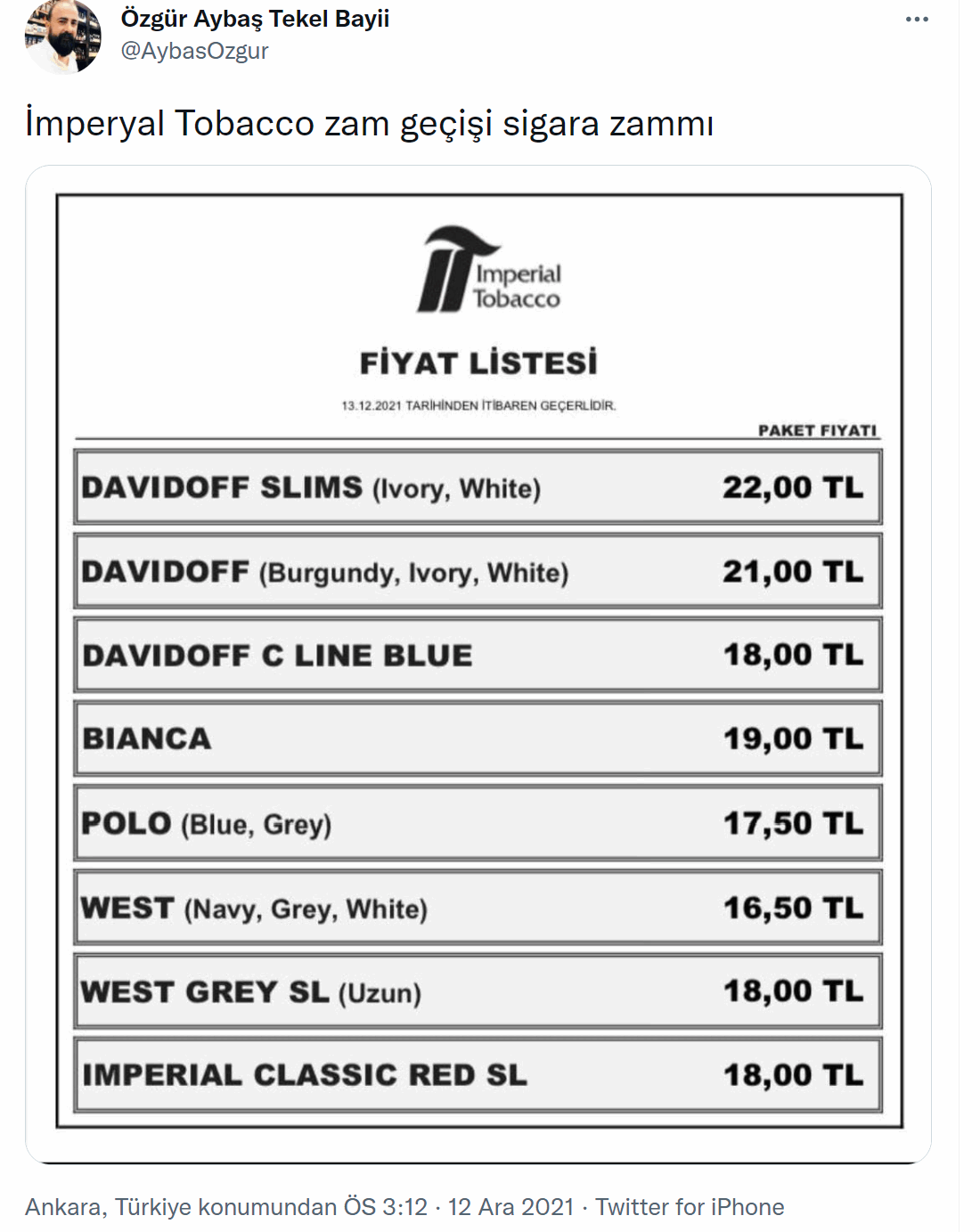 Philip Morris, JTI, BAT ve KT&G grubundaki sigaralara gelen zammın ardından Imperial Tobacco grubu da zamlandı. Türkiye Tekel Bayiler Platformu Başkanı Özgür Aybaş, sigaraya gelen son zammı Twitter hesabından duyurdu.