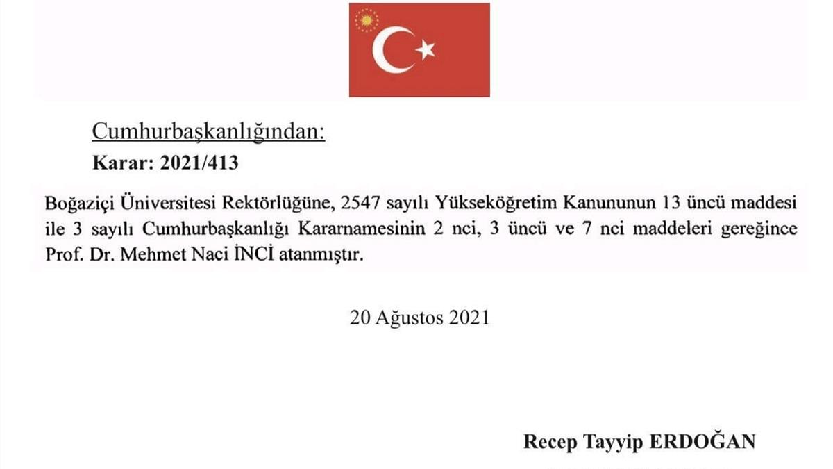 Cumhurbaşkanı Recep Tayyip Erdoğan'ın imzasıyla Resmi Gazete'de yayımlanan kararla Boğaziçi Üniversitesi Rektörlüğüne Prof. Dr. Mehmet Naci İnci atandı. Kararda "Boğaziçi Üniversitesi Rektörlüğüne, 2547 sayılı Yükseköğretim Kanununun 13 üncü maddesi ile 3 sayılı Cumhurbaşkanlığı Kararnamesinin 2 nci, 3 üncü ve 7 nci maddeleri gereğince Prof. Dr. Mehmet Naci İNCİ atanmıştır" ifadeleri kullanıldı.