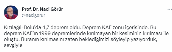 Twitter adresi üzerinden açıklama yapan Görür, deprem sonrası değerlendirmesine şu şekilde yer verdi: "Kızılağıl-Bolu'da 4,7 deprem oldu. Deprem KAF zonu içerisinde. Bu deprem KAF'ın 1999 depremlerinde kırılmayan bir kesiminin kırılması ile oluştu. Buranın kırılmasını zaten beklediğimizi söyleyip yazıyorduk, sevgiyle"