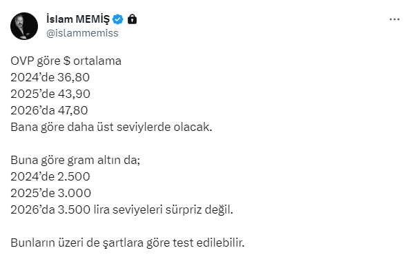 İslam Memiş'ten bir son dakika açıklaması geldi. Altın fiyatları hakkında yaptığı yorumları sürekli olarak takip edilen Memiş, sosyal medya hesabı üzerinden yaptığı son dakika açıklamasında altın fiyatları için yeni tahminini ve açıklanan OVP'ye göre beklentilerini bildirdi.