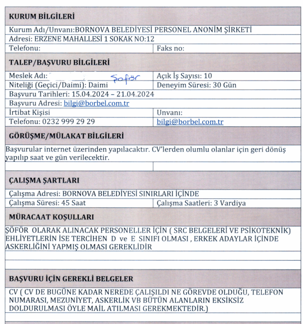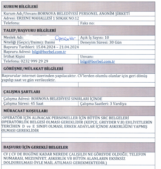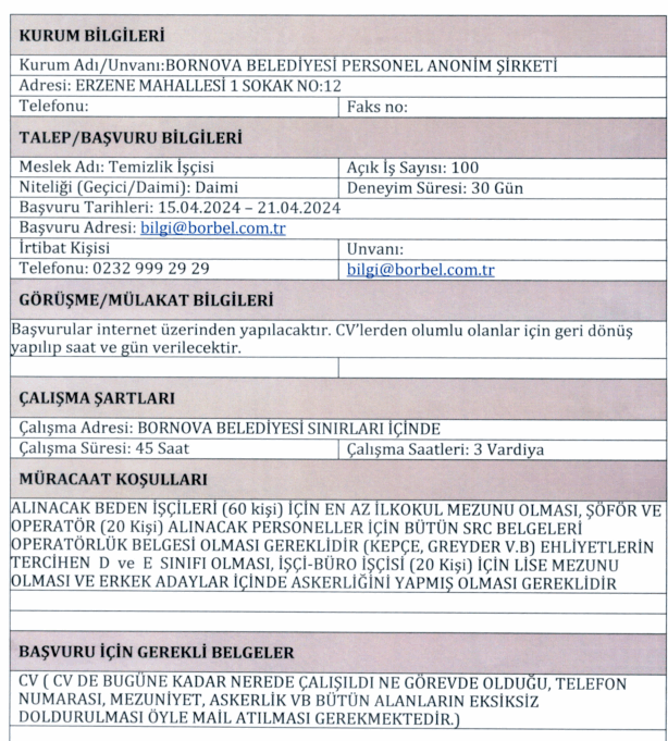 İlana başvuru yapacak adayların en az ilkokul mezunu olması gerekmektedir. Türkiye Cumhuriyeti vatandaşı olan adaylardan yapılacak personel ve işçi alımında başvuru bilgileri şu şekilde verildi: