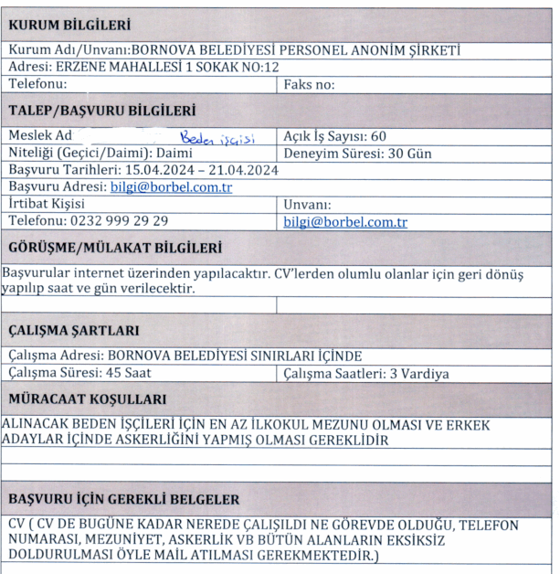 Bornova Belediyesi işçi ve personel alımı başvuru duyurusu İŞKUR üzerinden yayınlandı. Türkiye İş Kurumu kurum dışı kamu işçisi alımı ilanları kısmından yayınlanan duyuruda başvuru kılavuzlarına şu şekilde yer verildi: