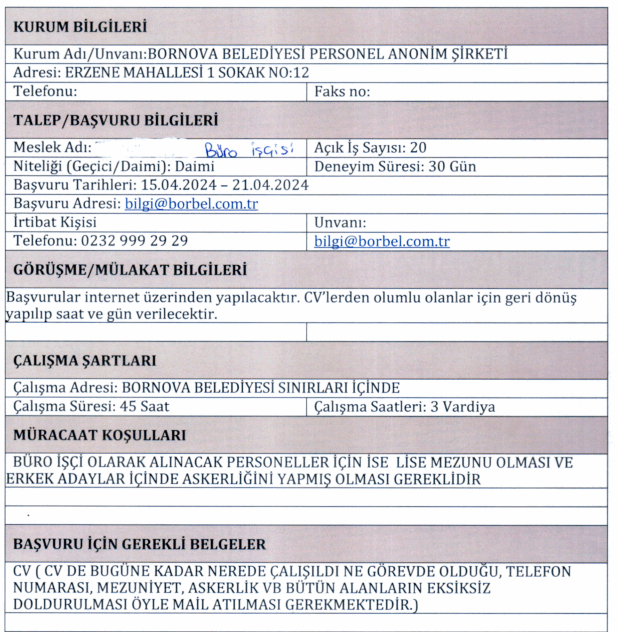 büro işçisi için en az lise mezunu olması ve erkek adaylar için askerliğini yapmış olması gerekmektedir.