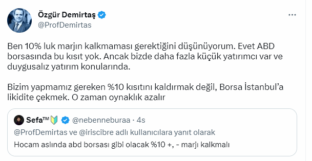 Borsada yüzde 10'luk marjın kaldırılmaması ile ilgili bir açıklama geldi. "Hocam aslında abd borsası gibi olacak %10 +, - marjı kalkmalı" şeklinde gelen yoruma yanıt veren Özgür Demirtaş, şu ifadeleri kullandı: