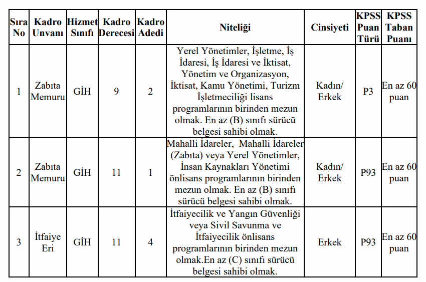 •İlan edilen zabıta memuru ve itfaiye eri kadroları için, mezun olunan okul itibarıyla öğrenim şartını taşımak ve bu öğrenimle ilgili olarak 2022 yılı Kamu Personel Seçme Sınavından (KPSS) alım yapılacak kadroların karşısındaki puan türlerinden, belirtilen asgari KPSS puanını almış olmak,