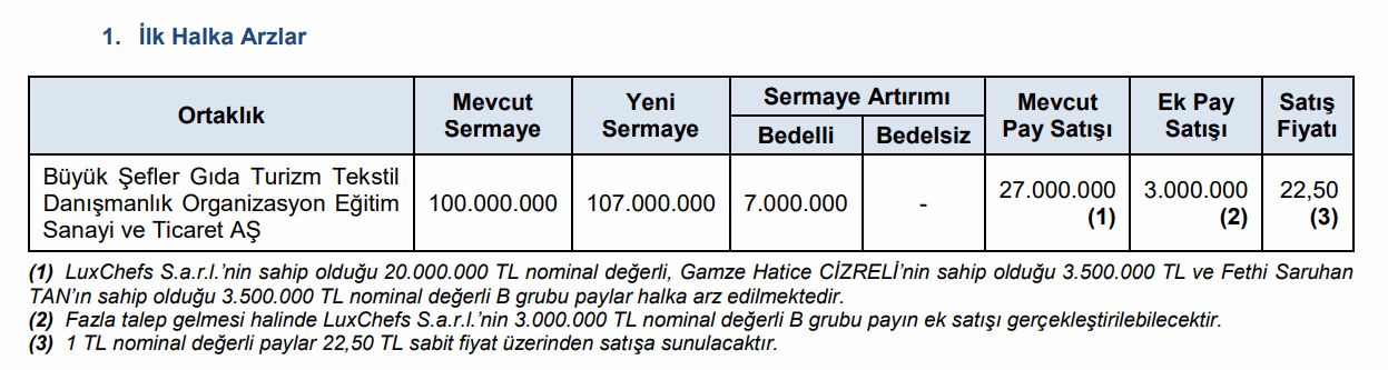 (1) LuxChefs S.a.r.l.'nin sahip olduğu 20.000.000 TL nominal değerli, Gamze Hatice CİZRELİ'nin sahip olduğu 3.500.000 TL ve Fethi Saruhan TAN'ın sahip olduğu 3.500.000 TL nominal değerli B grubu paylar halka arz edilmektedir.