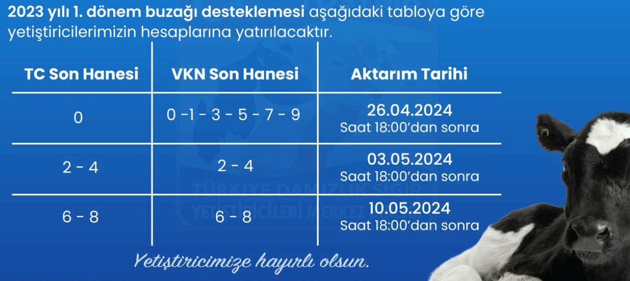"İlimizde 2023 Yılı 1. Dönem (Ekim,Kasım,Aralık) Buzağı Destek Ödemesi kapsamında; 9.897 yetiştiricimize 37 Milyon 464 Bin 637 TL destekleme ödemesi hesaplarına yatırılacaktır. Üreticilerimize hayırlı olsun"