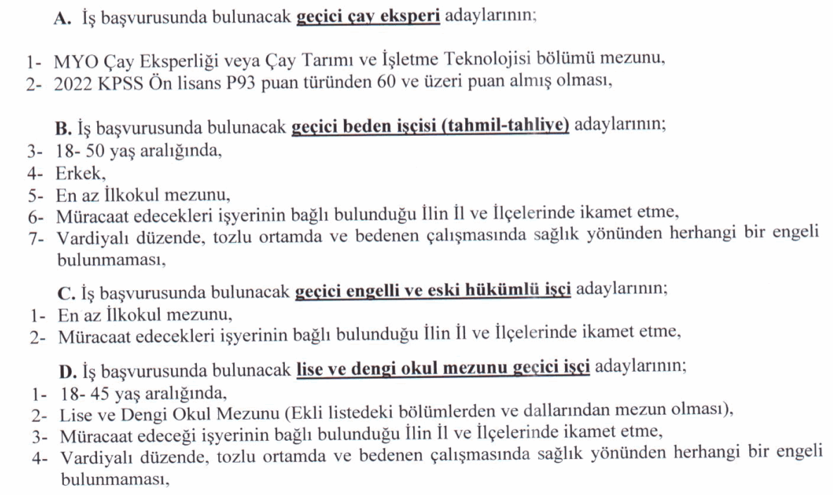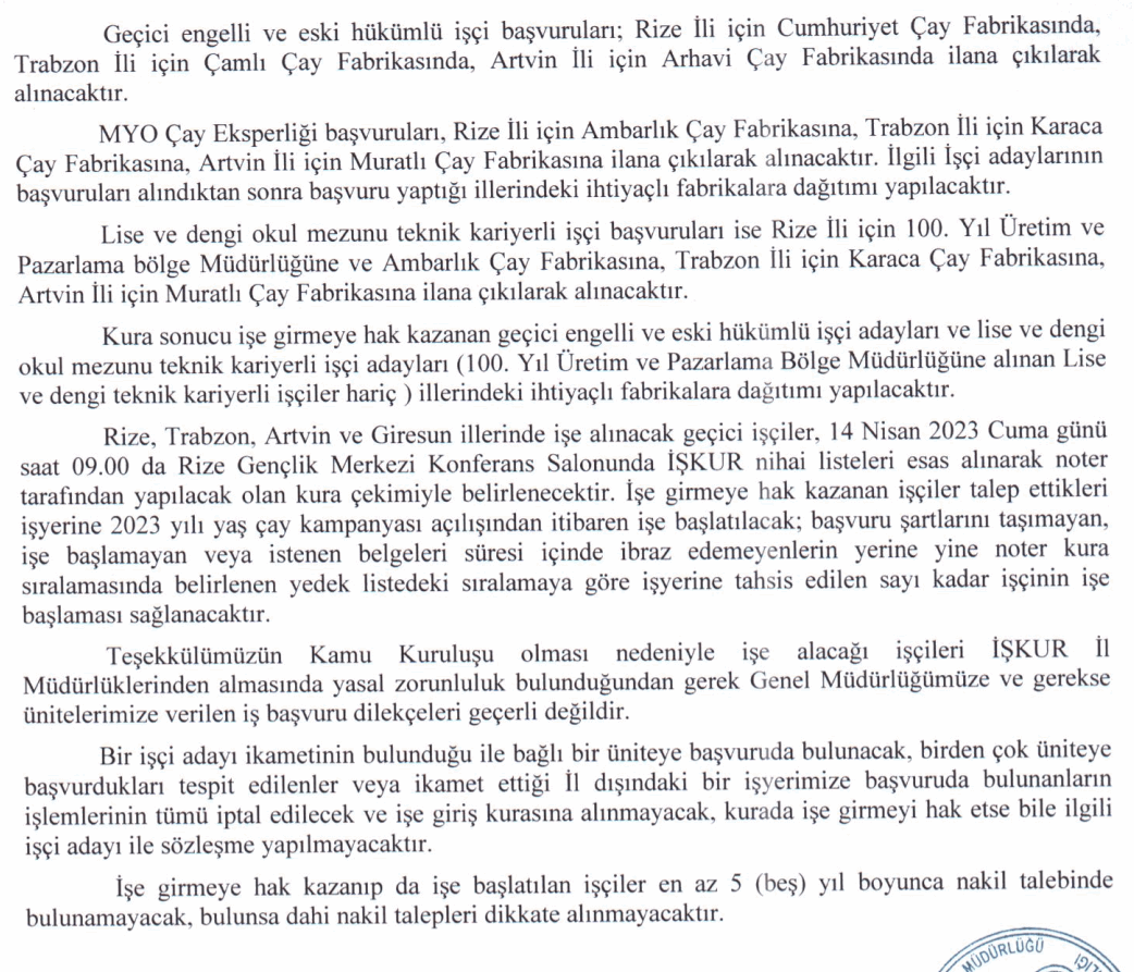 Çay İşletmesi Genel Müdürlüğü tarafından bir son dakika açıklaması yapıldı. Yapılan açıklamada farklı kadrolarda çalıştırmak üzere işçi alımı yapılacağına yer verildi.