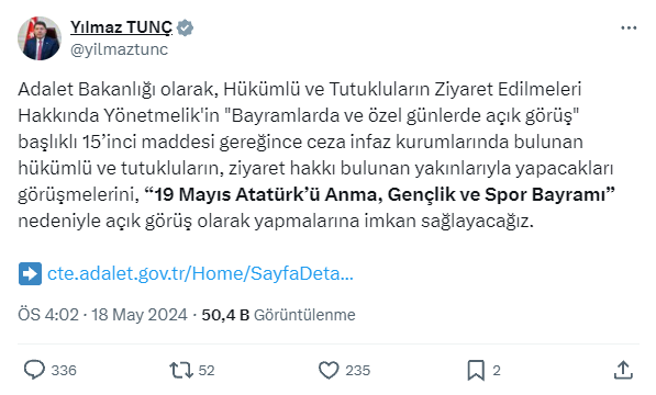 Sosyal medya hesabından yapılan açıklamada, Adalet Bakanlığı'nın Hükümlü ve Tutukluların Ziyaret Edilmeleri Hakkında Yönetmelik'in ilgili maddesi gereğince, bayramlar ve özel günlerde açık görüşlerin düzenlendiği belirtildi. Buna göre, ceza infaz kurumlarında bulunan hükümlü ve tutukluların, ziyaret hakkı olan yakınlarıyla 19 Mayıs'ta yapacakları görüşmelerin, "19 Mayıs Atatürk'ü Anma, Gençlik ve Spor Bayramı" nedeniyle açık görüş olarak gerçekleştirileceği ifade edildi.
