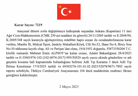 Kararla ayrıca, kasten öldürme suçundan cezaevinde bulunan Nihat İliman ile uyuşturucu ticareti nedeniyle cezavinde bulunan Sedat Çelik'in cezaları da sakatlık hali nedeniyle kaldırdı.