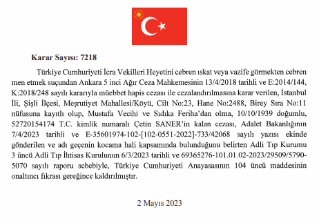 Cumhurbaşkanı Recep Tayyip Erdoğan'ın imzası ile bugün yayınlanan Cumhurbaşkanı Kararında biri Hizbullah davasından 4 mahkuma af geldi ve cezaları kaldırıldı. Söz konusu karar ile 28 Şubat davası kapsamında müebbet hapis cezası verilen eski Korgeneral Çetin Saner ile Hizbullah davası kapsamında ağırlaştırılmış müebbet hapis cezasına çarptırılan Mehmet Emin Alpsoy'un cezaları "kocama hali" nedeniyle kaldırıldı.